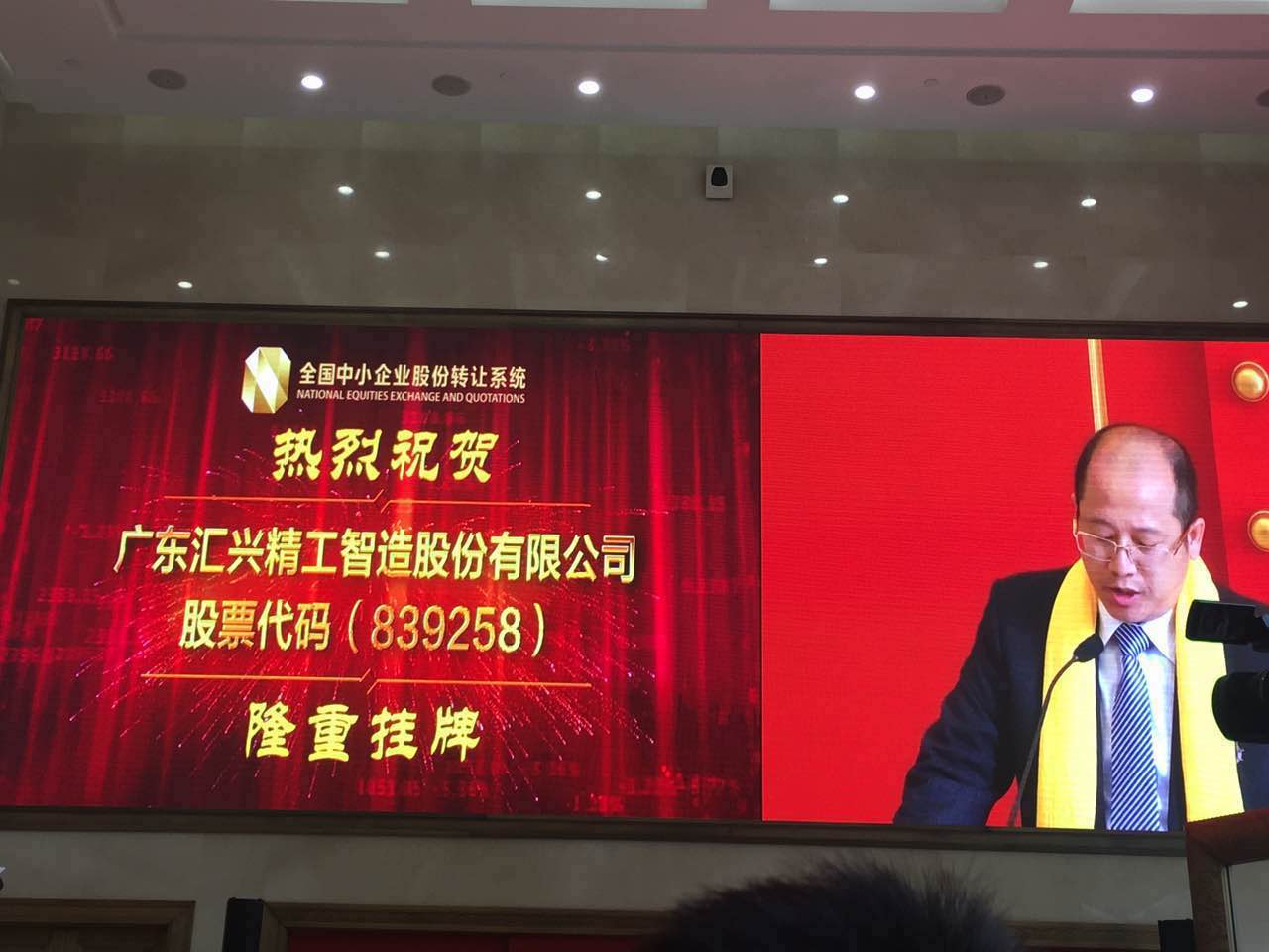 從2015年,匯興智造啟動進軍資本市場的戰略,在東莞證券股份有限公司、大信會計師事務所(特殊普通合伙)、廣東莞泰律師事務所等合作伙伴、各級政府、社會各界的幫助下,開始“新三板”掛牌籌備工作,并于2016年5月完成了股份制改造直至今日(2016年11月1日上午10點)在全國中小企業股份轉讓系統儀式大廳成功掛牌上市。