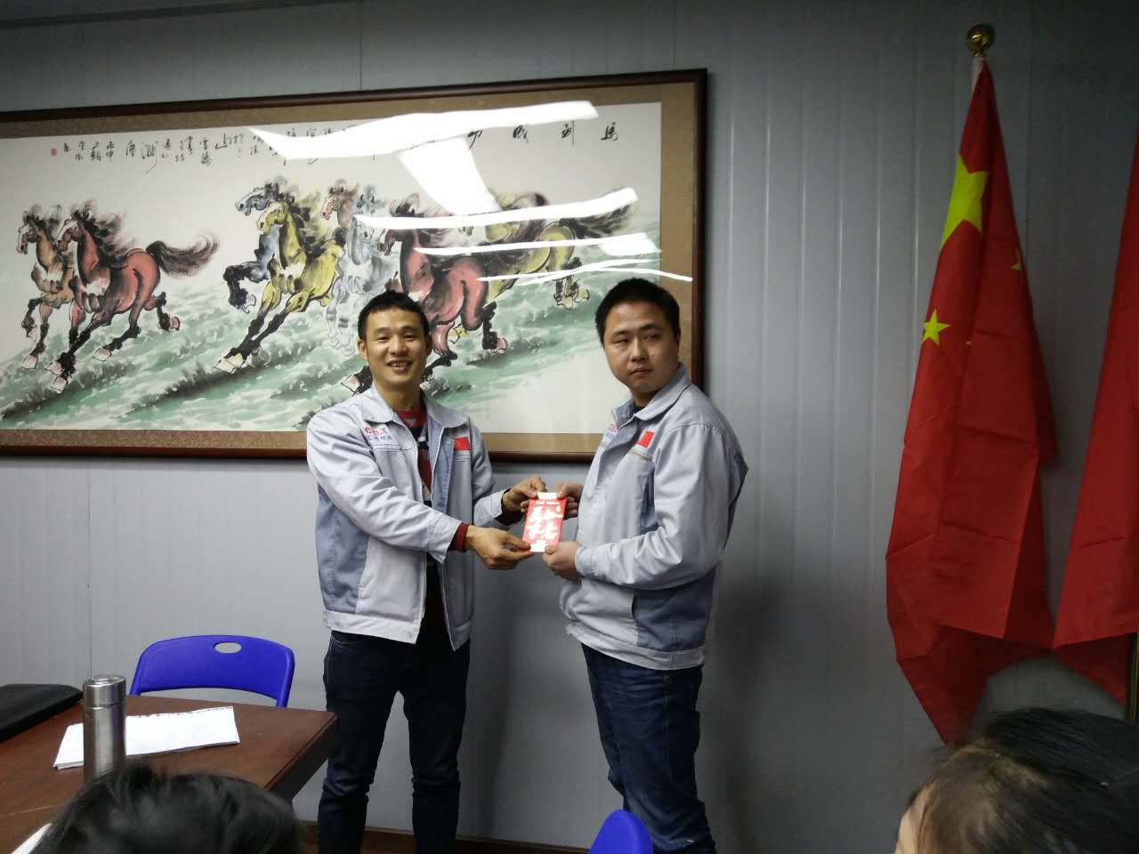 大會(huì)進(jìn)行到尾聲,對每月度之星的選舉。胡總(圖左)為月度之星徐財(cái)華戰(zhàn)士(圖右)頒發(fā)獎(jiǎng)金。同時(shí)感謝他對于公司的無私奉獻(xiàn),對于同事的無微關(guān)懷,并擁護(hù)匯利興這個(gè)大家庭;同時(shí)匯利興還有很多人都在默默地奉獻(xiàn)與努力(例如:成都辦事處的張國桃經(jīng)理,在今年6月17日與戰(zhàn)車傳奇進(jìn)軍成都開疆?dāng)U土、奮戰(zhàn)近一年),在此感謝他無私的奉獻(xiàn)。匯興智造有著你們這群人的努力與付出,相信我們會(huì)更加靠近我們的夢,實(shí)現(xiàn)中國智能裝備全產(chǎn)業(yè)鏈集成智造標(biāo)桿,繼續(xù)引領(lǐng)行業(yè)的發(fā)展。