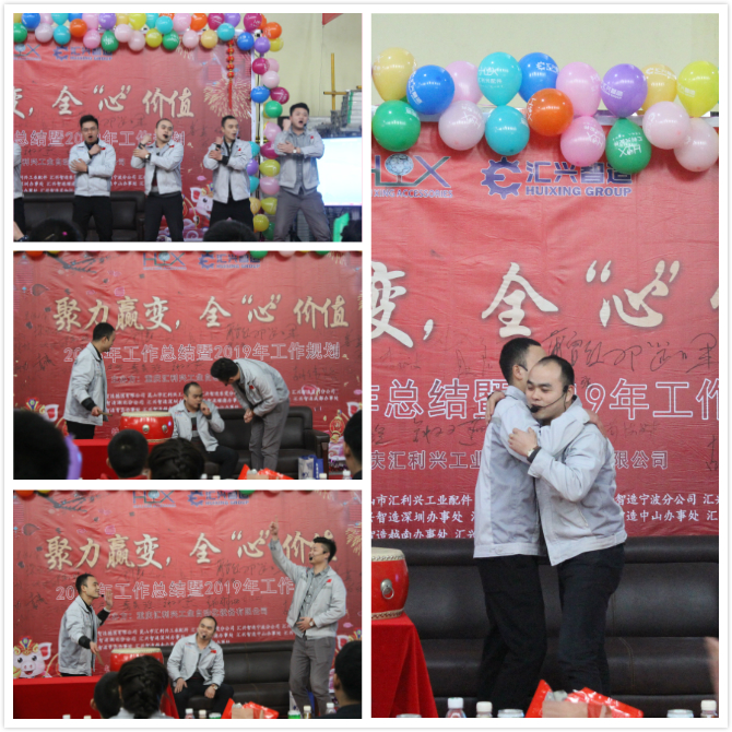 《開門紅》舞蹈 緊接著是一場聽覺的盛宴,胡總和胡前敏家人帶來的詩朗誦,貫穿著唯美的中國風韻,溫和而又親切的聲音屢現(xiàn)耳旁,字里行間都展示了感恩之心的重要性。 小品《推銷》,銷售部家人演繹的惟妙惟肖,穿插著銷售部全體家人精神面貌,一聲聲“為夢想沖刺,我是匯利興的一名忠誠戰(zhàn)士”,現(xiàn)場士氣高昂、力量雄厚;從側(cè)面展示了雖一路挫折無數(shù)坎坷無數(shù),但決不放棄的信心與理念,并將公司精神面貌鮮活的展現(xiàn)在眾人面前,為他們點贊! 點燃全場的一曲《相親相愛一家人》,物控部每位家人相互搭肩,每個人都唱出了自己的心聲,我們是一家人,相親相愛的一家人,希望家人們在2019年不忘初心,再出發(fā)。