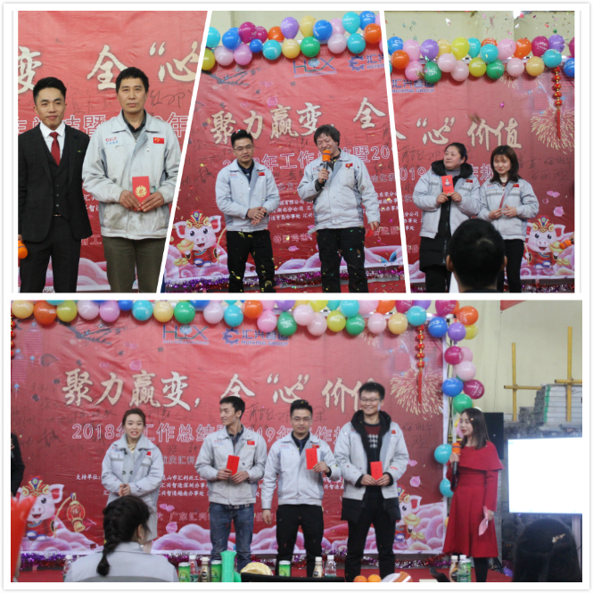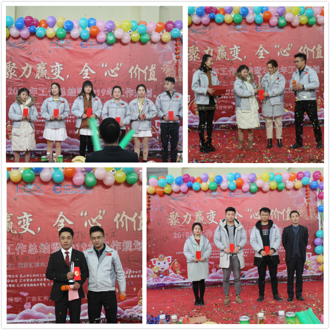 特等獎、一等獎、二等獎、三等獎 人生百味,五味最常在-品嘗人生五味象牙塔(酸、甜、苦、辣、咸),胡總攜全體家人們一起品嘗五味,一起嘗遍酸、甜、苦、辣、咸,回味2018年點點滴滴幸福的甜及幸福的苦,一起同甘苦共患難,也正是有了這五味,讓匯興生活多姿多彩。 緊接著進入頒獎環(huán)節(jié),對2018年中所取得成績及進步的家人分別頒發(fā)了最佳付出獎、最佳團隊獎、最佳進步獎、鼓勵獎,以資鼓勵。隨后胡總宣讀人事任命(任命熊學斌為銷售副總、周榮任命為物控主管、蒲曾紅任命為外省市場部負責人)。  最佳進步、最佳團隊、最佳付出、鼓勵獎 隨著時間的推移,年會逐步接近尾聲,全體匯興家人合唱匯利興之歌《相信我們會創(chuàng)造奇跡》,會議就隨著家人們的歌聲而告一段落,但匯興人追夢的腳步卻一直在前進。夢想是豐滿的,未來更值得期待,2019年匯興人將用行動詮釋“聚力贏變,全心價值”,加油!