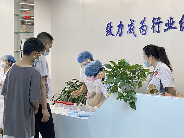 為加強新冠肺炎疫情防控工作 ,有效實施對新冠肺炎的預防、控制工作,保證員工健康安全。匯利興西南工廠積極響應國家防疫號召,主動做好疫情防控工作,于2021年8月7日上午為全體員工開展核酸檢測,為全體員工的安全健康加上一層“防護盾”,確保全體員工都能以健康的身體、積極的心態投入工作中,進一步為疫情防控企業做好疫情防控榜樣。 疫情防控,人人有責。為確保疫情防控和安全生產工作兩不誤原則,同時盡最大努力降低員工外出感染的風險,行政部提前與醫院進行溝通銜接,通過采取醫院派醫務人員到廠區內進行采樣的方式,為員工安全健康保駕護航。 檢測現場,醫務人員嚴格執行檢測流程,對每一位參檢人員進行實名登記驗證,填寫樣本采集申請單,發放檢測工具。為防止人員扎堆聚集,等候人員都需間隔1米以上,以部門分批次、分時段進行檢測,并反復核對個人信息并記錄,確保信息準確無誤。