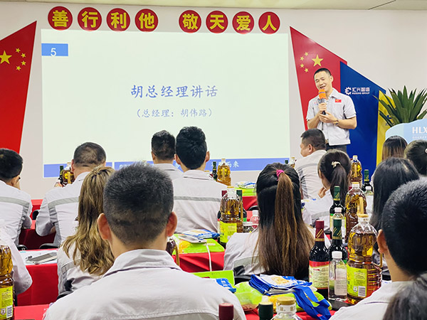 與時光握手,與歲月言和。成長不期而遇,用真切的祝福拉開壽星們的生日會,不僅讓壽星們的生日過得更有意義,也使每一位員工都能切身的感受到公司的溫暖和領導的用心,也讓每個人所經歷的平凡歲月里,都可以連續發生不一樣的驚喜。再次祝福壽星們生日快樂! 會議第五項,胡偉路總經理講話。首先胡總經理感嘆時光飛逝,歲月如梭,驀然回首,已到初秋之際,2021年僅剩下僅有的100多天,在這攻堅的三月里,全體員工仍需拿出“紅軍不怕遠征難 萬水千山只等閑”的民族氣概,朝著我們的目標拿出我們的士氣卯足勁兒的向前沖;其二、胡總經理向全體員工展示公司中秋禮品并解析禮品寓意(柴、米、油、鹽、醬、醋、茶),以生活中不可缺之的物品讓全體員工深刻感受到公司的關懷和關愛,并從側面宣導全體員工在工作崗位中,對待同事要有溫度,對待工作要有態度;花若盛開,蝴蝶自來,你若精彩,上天自會安排;其三、通過一則短視頻向全體員工宣導反哺之恩 、舐犢之情,進一步勉勵全體員工要有一顆感恩的心,感恩身邊的人;其四、創立夢想基金,鼓勵員工加大產值賦能,為公司為個人謀福利;同時也進一步勉勵全體員工,“寶劍鋒從磨礪出,梅花香自苦寒來”,只要我們一起努力,相信我們一定會實現我們的目標,讓我們一起擼起袖子加油干!
