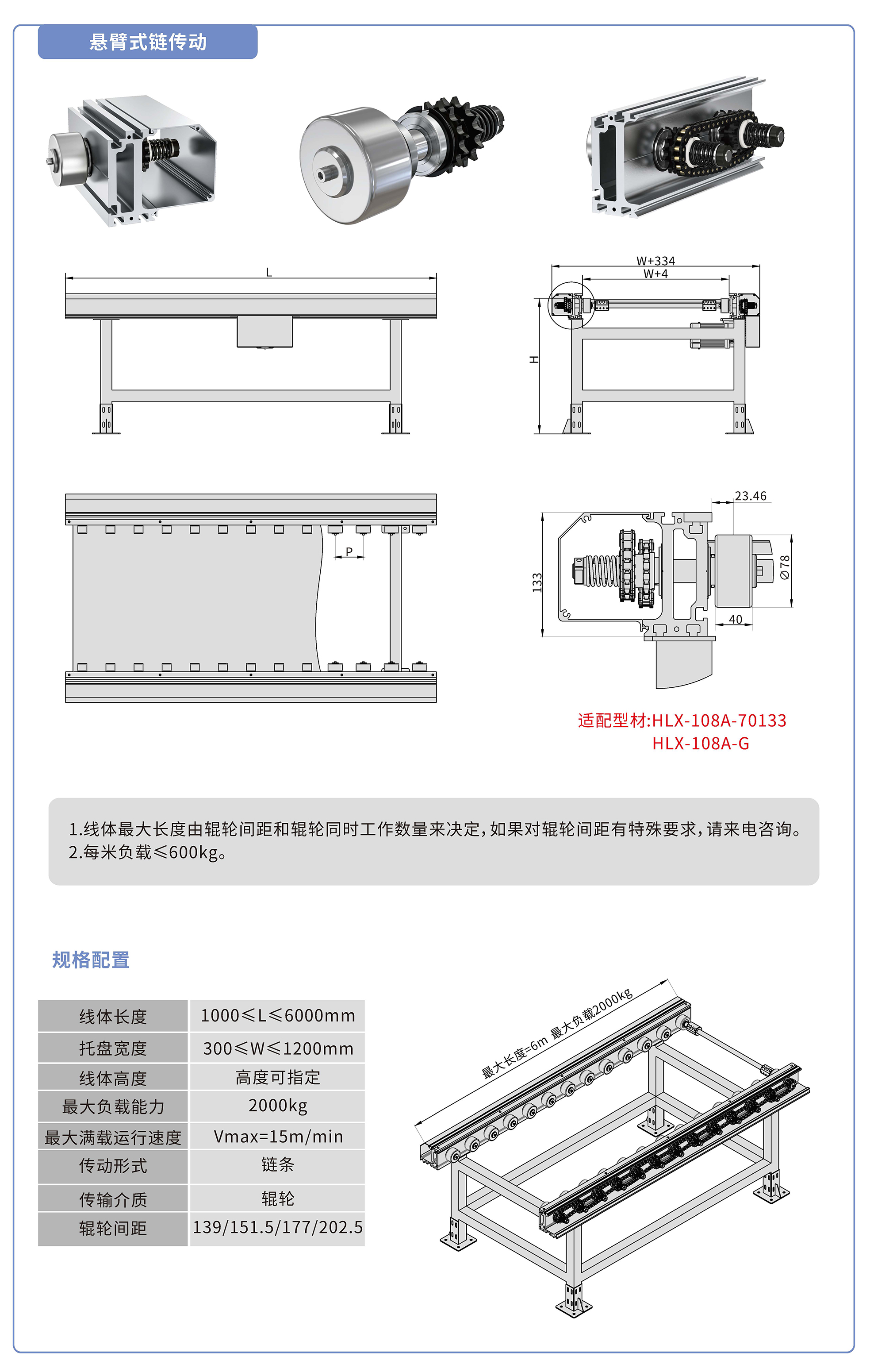 采用70133鋁型材,鏈輪傳動(dòng),鍍鉻滾輪鑲嵌銅套實(shí)現(xiàn)積放功能,負(fù)載2000kg/米,最大負(fù)載速度15M/min, 輪距139、151.5、177、202.5可選,適用托盤寬度300-1200mm,線體長(zhǎng)度范圍1000-6000mm, 高度根據(jù)需求定制.