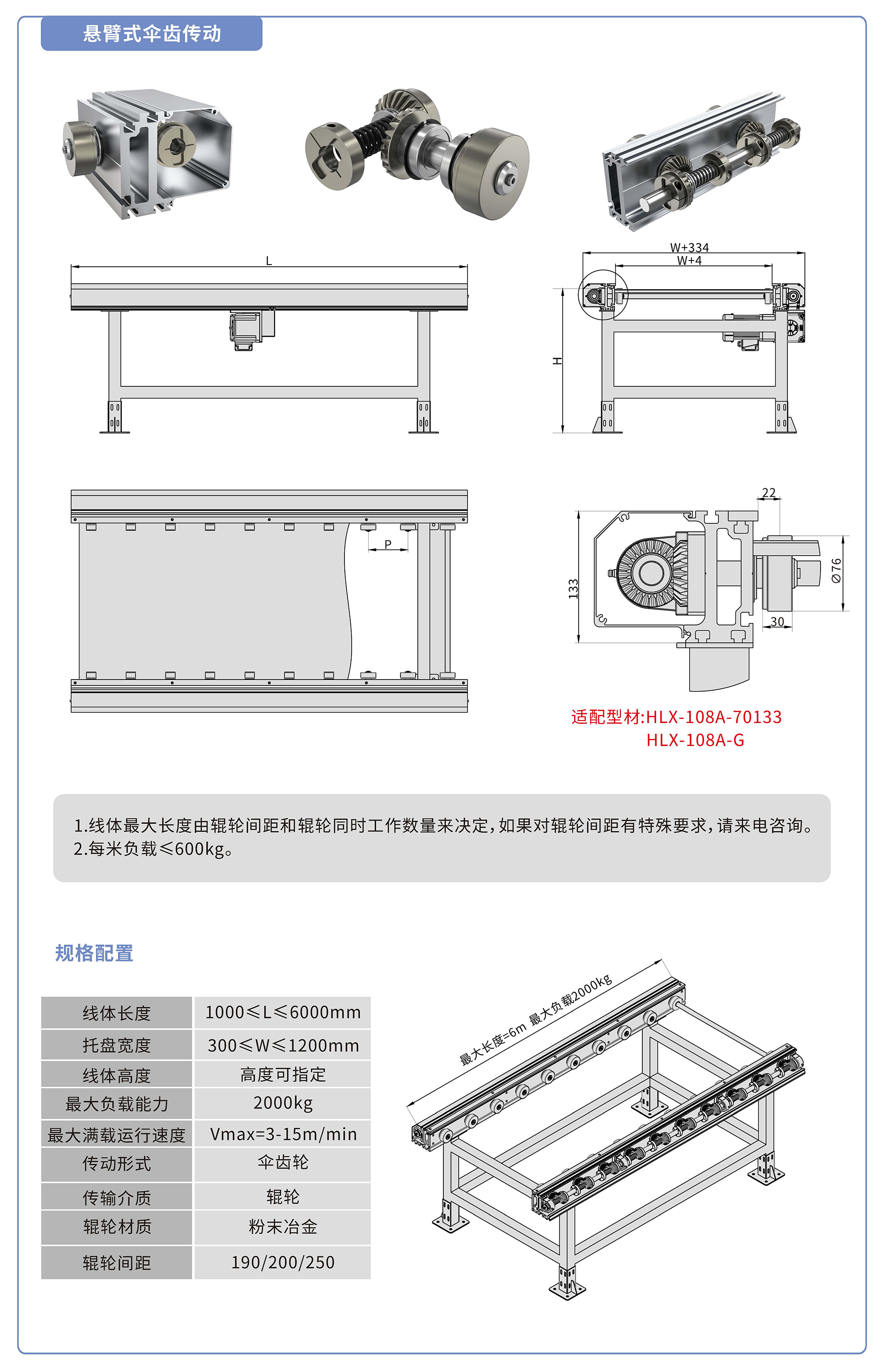 采用70133鋁型材,傘齒驅動,粉末冶金滾輪鑲嵌銅套實現(xiàn)積放功能,負載2000kg/米,最大負載速度15M/min, 輪距190、200、250可選,適用托盤寬度300-1200mm,線體長度范圍1000-6000mm, 高度根據(jù)需求定制.