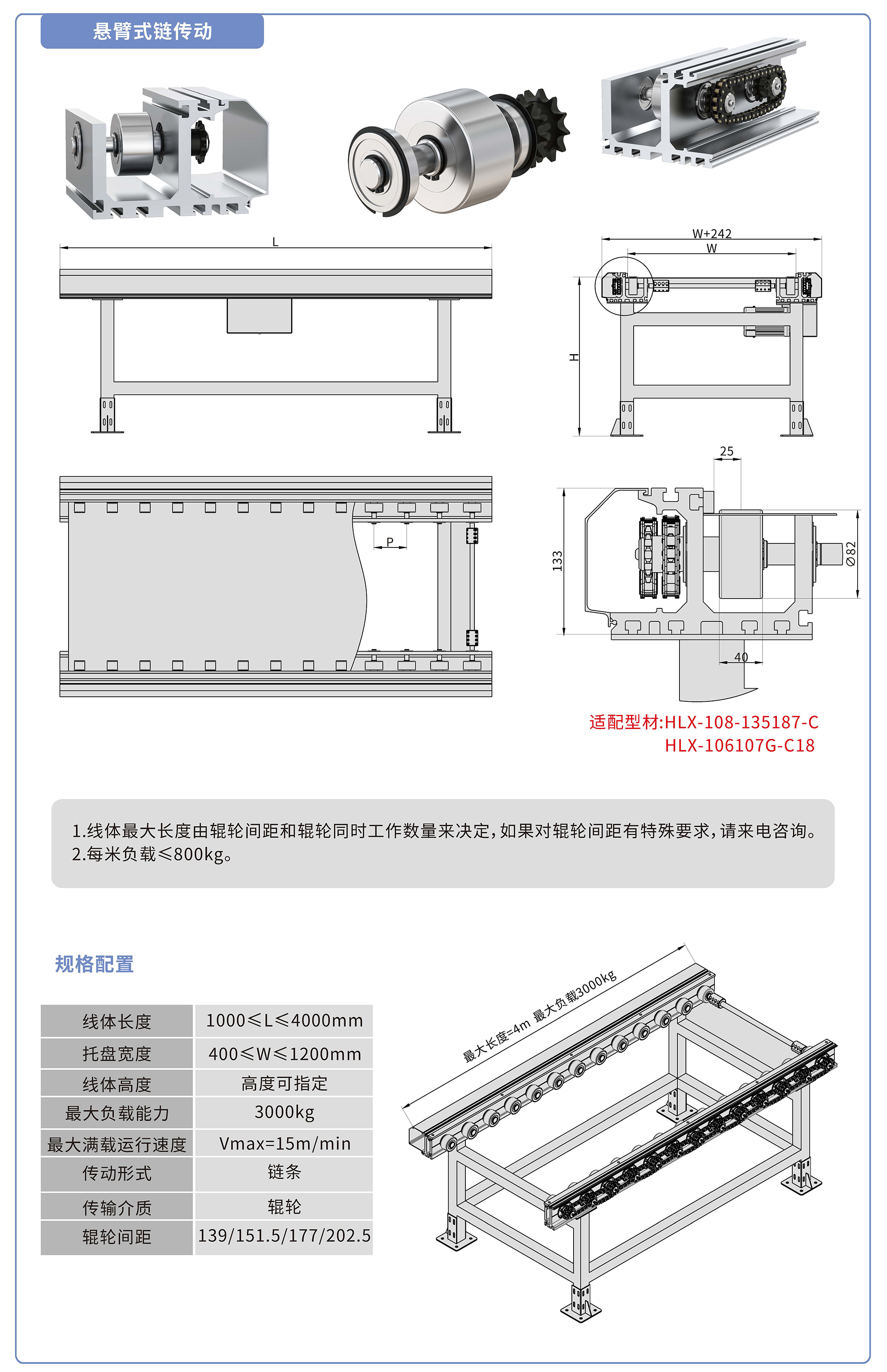采用135187鋁型材,鏈輪傳動,鍍鉻滾輪鑲嵌銅套實現(xiàn)積放功能,負載3000kg/米,最大負載速度15M/min, 輪距139、151.5、177、202.5可選,適用托盤寬度400-1200mm,線體長度范圍1000-4000mm, 高度根據需求定制.